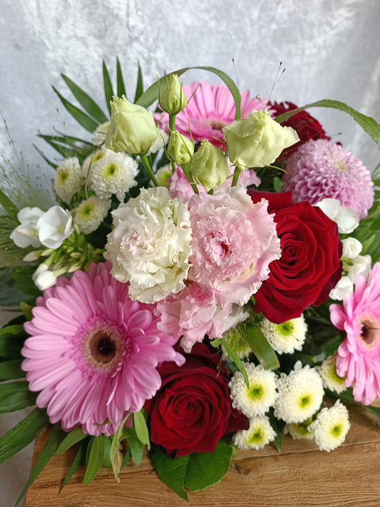 Composizione fiorita in diverse tonalità di rosa e bianco