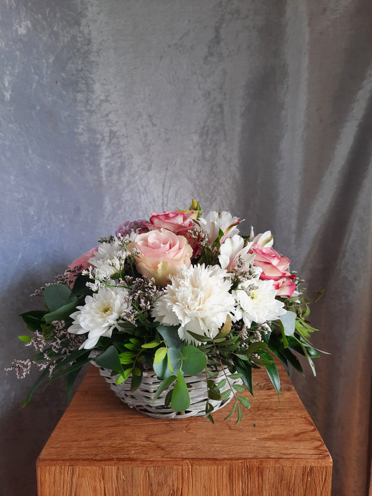 Composizione fiorita in diverse tonalità di rosa e bianco