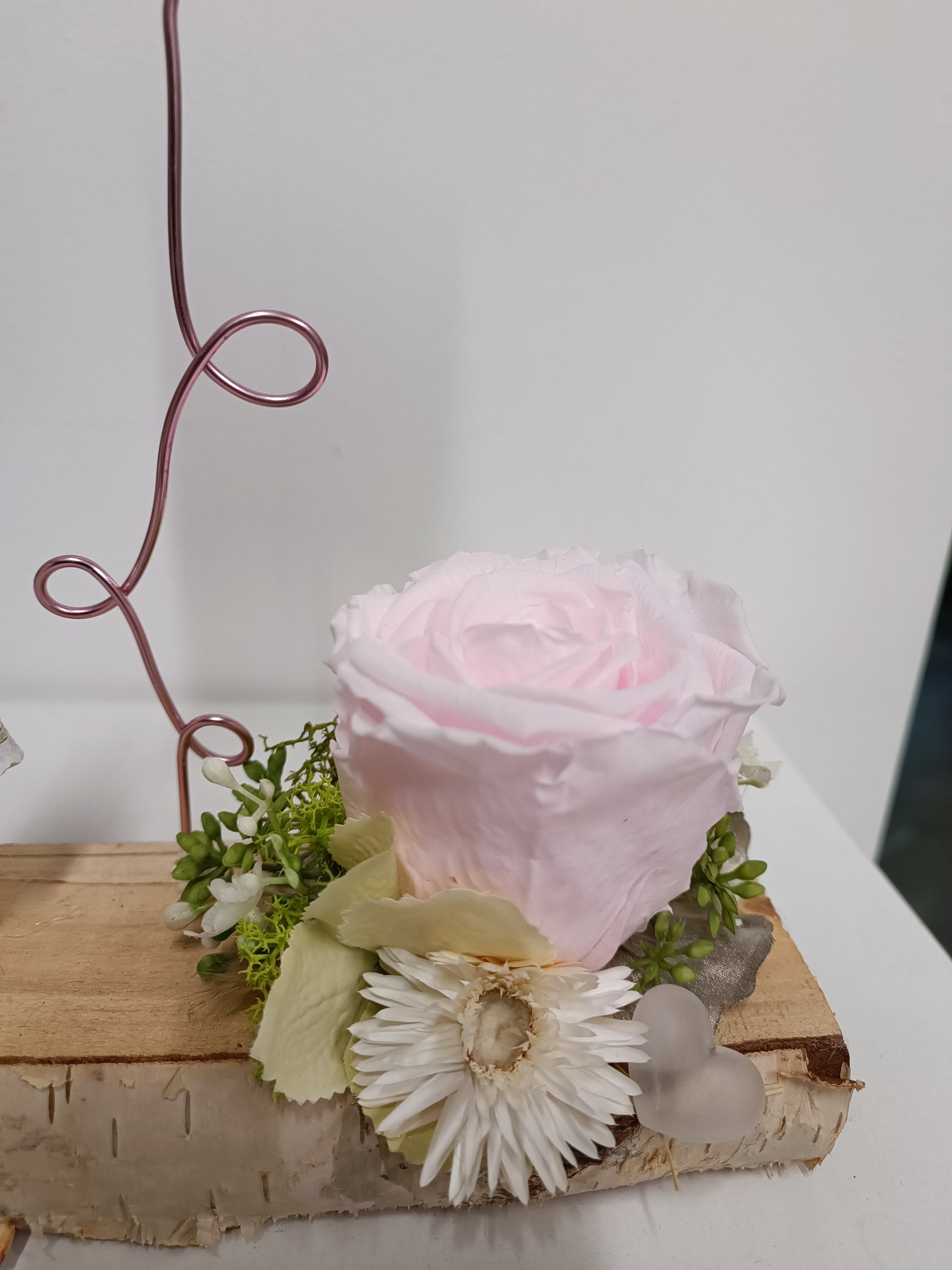 Idea regalo o decorativa con rosa stabilizzata, oggetto e porta foto/messaggio.