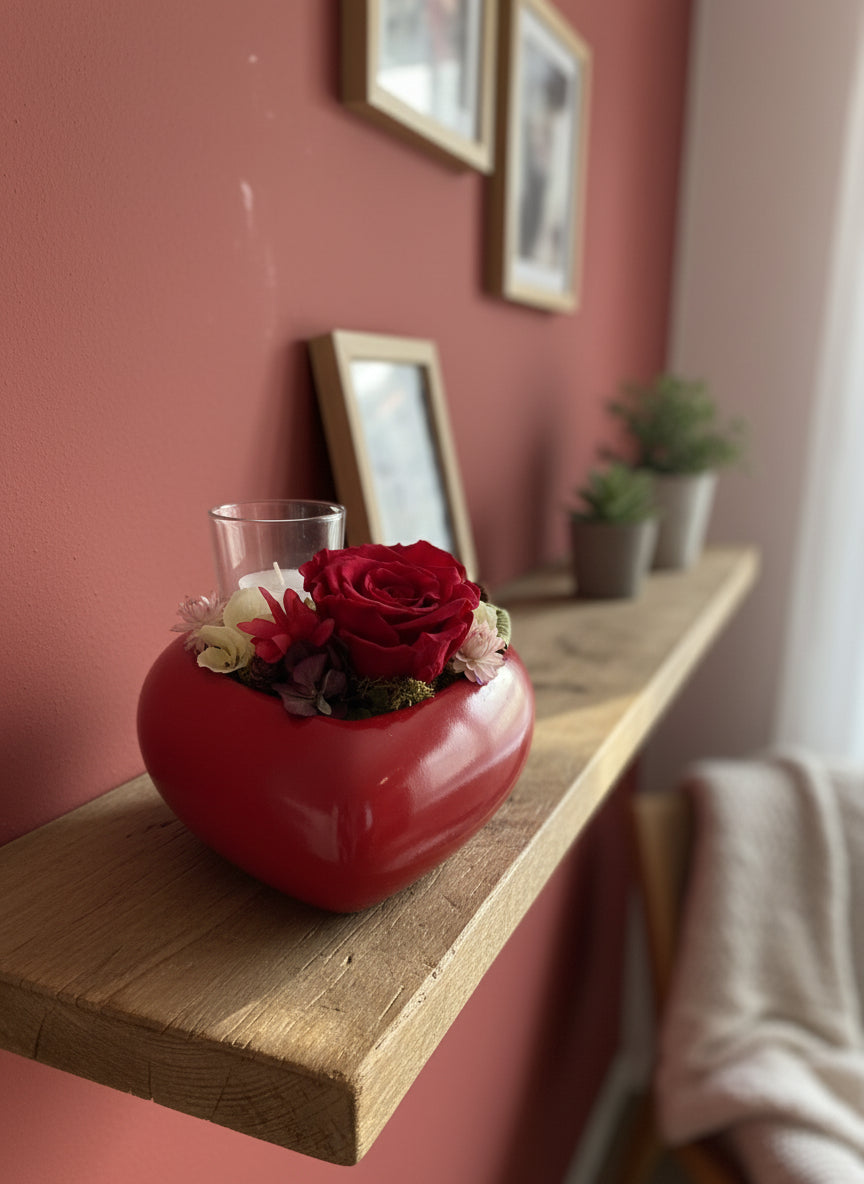 Cuore in cemento pitturato con rosa stabilizzata, decorazione e vasetto in vetro con candela.