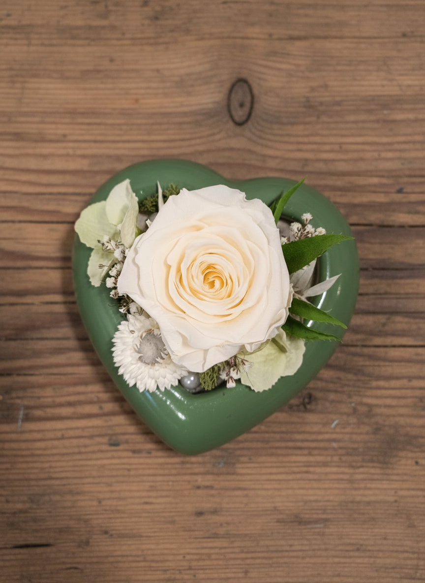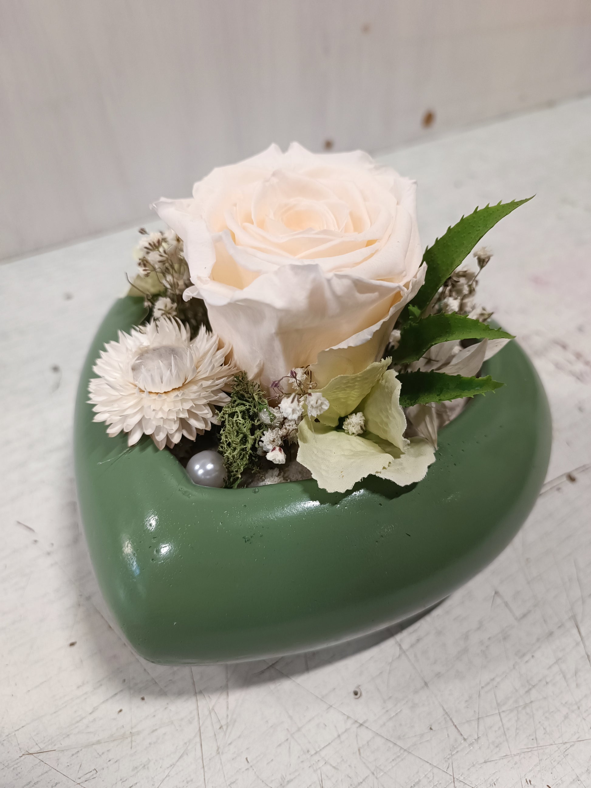 Cuore in cemento pitturato con rosa stabilizzata e decorazione.