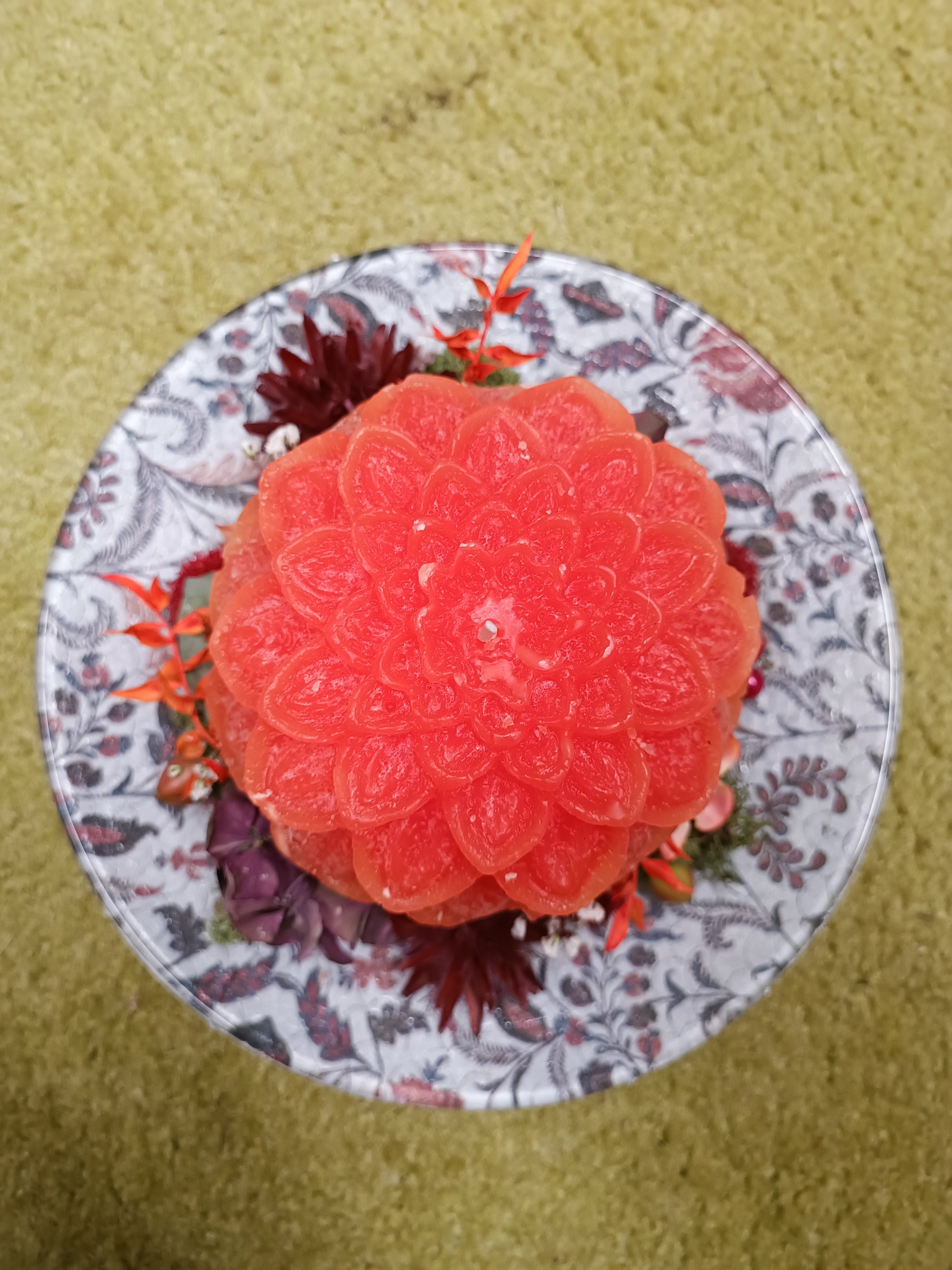 Piatto in vetro con candela a forma di dalia con decorazione.