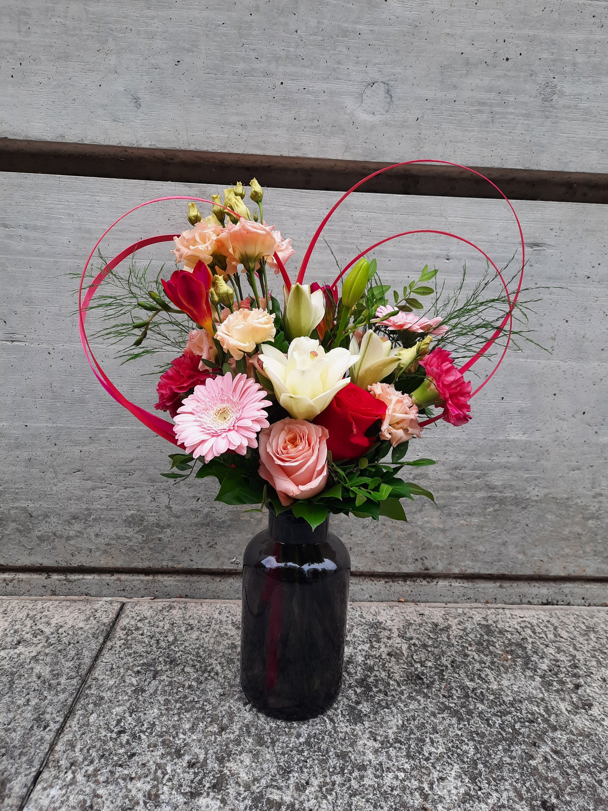 Mazzo legato di fiori recisi con inserto in legno colorato a forma di cuore.